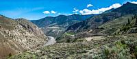 Mooi panorama van de rivier die stroomt door het dal tussen machtige bergen.