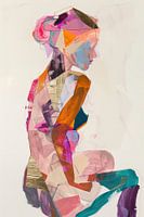 Color Whispers - Dit vrouwen schilderij presenteert een expressieve afbeelding van een vrouwelijke figuur, weergegeven in een abstract-expressionistische stijl. Het kunstwerk speelt met een spectrum aan kleuren en vormen die overlappen en samensmelten om het silhouet en het profiel van de vrouw vorm te geven. Haar pose is sereen, met…