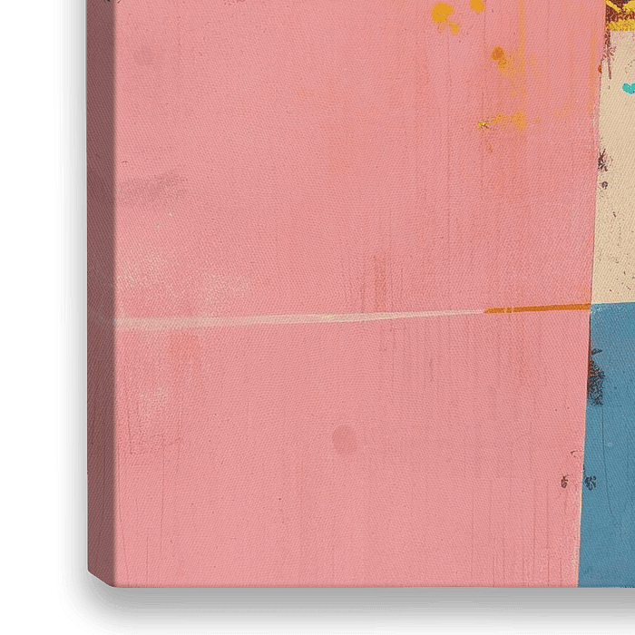 ColorPlay - Dit abstracte schilderij kenmerkt zich door een levendige collage van geometrische vormen en felle kleuren, waaronder pastelroze, oranje, geel, en diverse blauwtinten, met visuele texturen en subtiele krassen die een dynamisch geheel vormen.