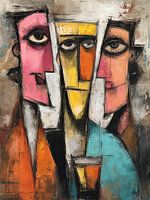 Colorful Faces - Dit abstracte schilderij toont drie geometrische gezichten in opvallende kleuren zoals helder roze, geeloranje, en zwart, die samen een intrigerende, moderne compositie vormen.