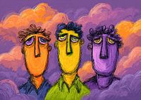 Colorful Faces - Dit is een schilderij van drie gelaatsuitdrukkingen, waarbij elke persoon in een heldere, unieke kleur is afgebeeld; het schilderij heeft een speelse cartoonachtige stijl die de emoties van de gezichten accentueert, alles tegen een achtergrond van zachte paarse en oranje wolken.