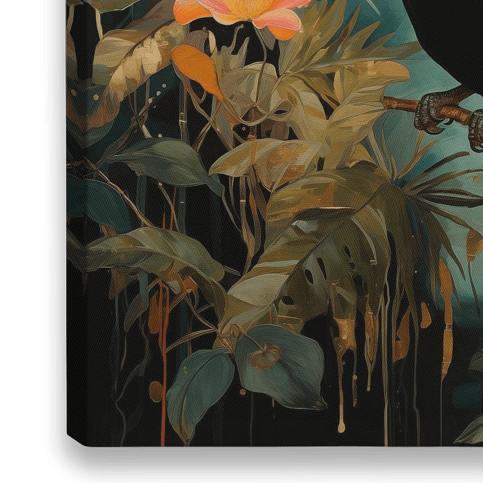 Een kleurrijk digitaal portret van een Toekan in het oerwoud. Het werk geeft een warme en rustieke uitstraling van uw interieur!