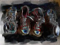 Abstract digitale gouache schilderij van twee paar basketbal schoenen op grijze beton achtergrond