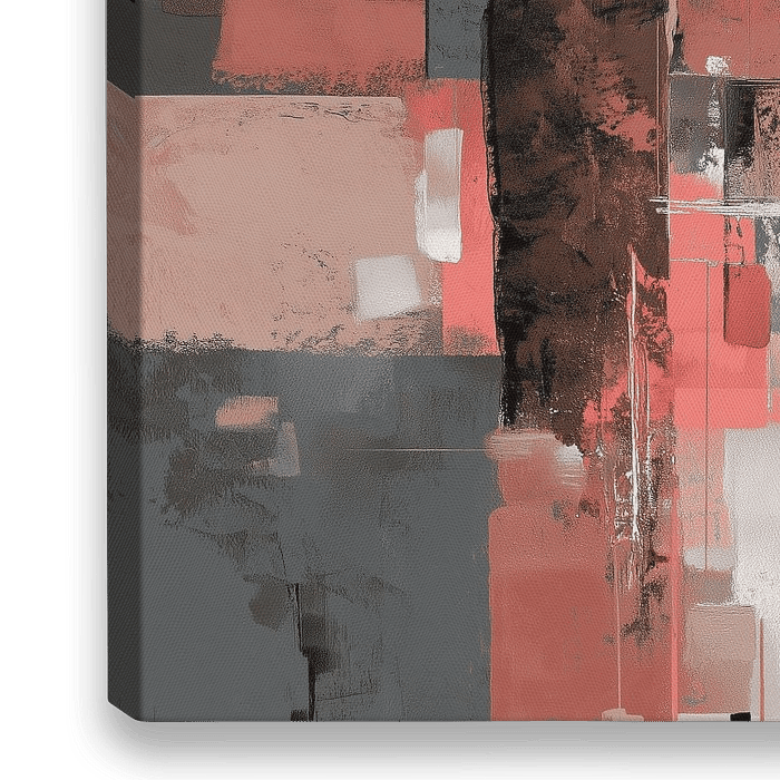 Coral Column - dit abstract schilderij toont een groot koraalrood vlak tegenover een stevige donkere verticale pilaar-achtige vorm, in een modern geometrisch, textuurrijk beeld met blokken en zachte overgangen in grijs, bruin en wit — ideaal als je zoekt op abstract schilderij of schilderij abstract of modern schilderij.