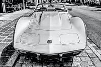 De foto toont een Corvette Stingray, gefotografeerd in zwart-wit, wat het silhouet van de klassieke sportwagen een tijdloze elegantie geeft. De vlakke, scherpe lijnen en de opvallende, lage voorkant van het voertuig zien er bijzonder krachtig en gestroomlijnd uit. Het glanzende metaal van de carrosserie weerkaatst het licht, waardoor…