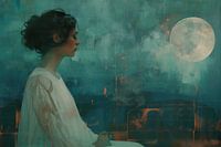 Cosmic Dream Gaze - Dit vrouwen schilderij toont een vrouw met een verstilde, serene blik, geprofileerd tegen een mystieke, nachtelijke achtergrond. De vrouw heeft een lichte, bijna doorschijnende huid, en haar donkere haar is opgestoken in een nonchalante, losse stijl die elegantie uitstraalt. Ze draagt een delicate witte jurk met fijn…