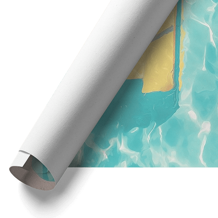 Een sfeervolle zwembadscène in zomerse pasteltinten, waarbij een gele trap met metalen leuning contrasteert tegen een roze betonnen rand en turquoise zwembadwater. Het spel van licht en schaduw op het wateroppervlak creëert een dromerige, nostalgische sfeer die doet denken aan een warme zomerdag bij het zwembad.