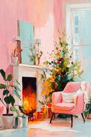 Een sfeervolle compositie waarin een moderne roze fauteuil naast een brandende open haard staat, omringd door weelderige kamerplanten en een uitbundig bloemenarrangement. De ruimte is gedecoreerd in zachte pasteltinten van roze en mint, met feestelijke cadeaus bij de haard. Het impressionistische schilderwerk geeft het geheel een…