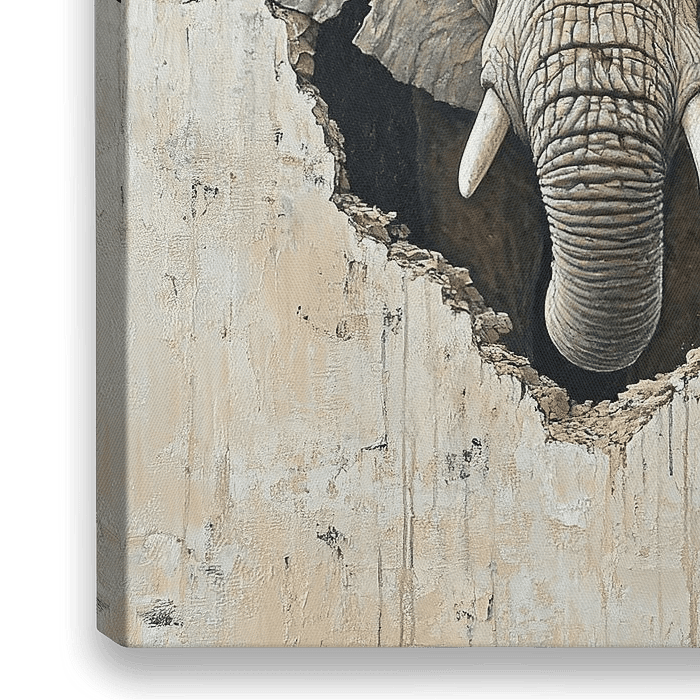 Cracked View - Dit olifant schilderij toont een realistische olifant die kijker recht aankijkt vanuit een gescheurde ruimte in een oude, verweerde muur, die een sterk contrast creëert tussen de texturen van de muur en de gedetailleerde weergave van de olifant.
