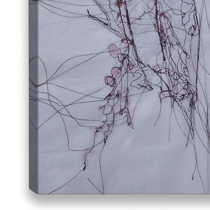 Een figuratief abstract werk van bordeaux rood draad op doek.
