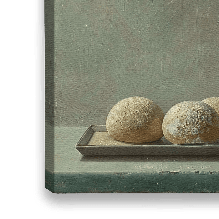 Crusty Comfort - Dit stilleven schilderij toont drie realistisch weergegeven broden met een korstige textuur, die geserveerd zijn op een verweerde, groene dienblad tegen een zacht groene achtergrond.