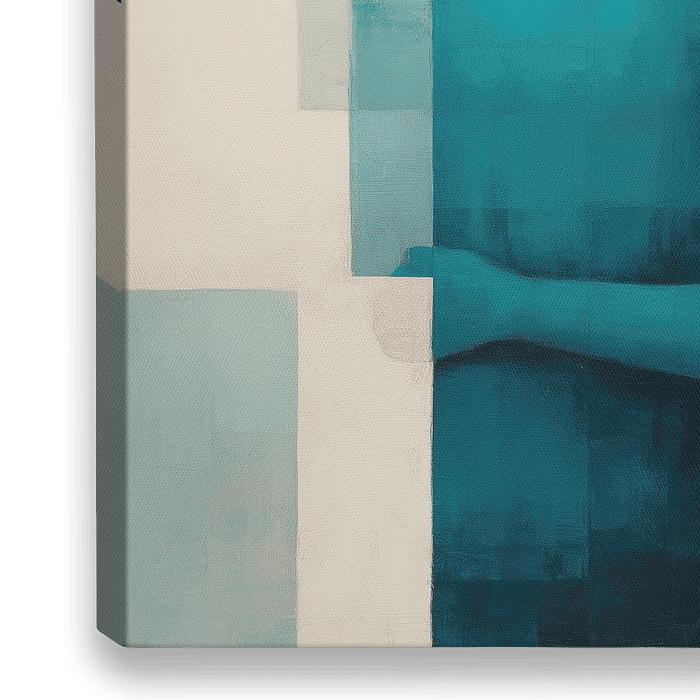 Een zachte omhelzing gevangen in kalme tinten blauw en wit. De figuren zijn deels vervaagd in blokken, alsof herinneringen zichzelf stukje bij beetje onthullen of verbergen.
