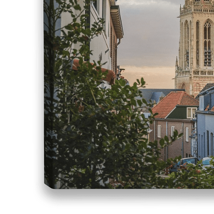 Uitzicht op de Cuneratoren via een van de smalle straatjes in het historisch centrum van het stadje Rhenen. De contrastrijke wolkenlucht geeft een authentieke sfeer.