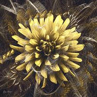 Een grote gele Dahlia met hele fijne lijnen en structuren in goud en goudgele kleuren. De foto heeft een vintage uitstraling.