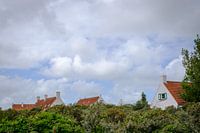De daken van huizen onder een bewolkte lucht aan de rand van de duinen-begroeiing in De Panne, België.