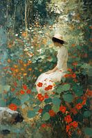 Een impressionistisch schilderij dat een serene zomerse scène vangt in een weelderige tuin. Een figuur in een witte jurk en strohoed zit verstild tussen felrode klaprozen en witte bloemen tegen een achtergrond van zachtgroene tinten. Het werk straalt rust en contemplatie uit, terwijl het spel van licht en schaduw een dromerige atmosfeer…