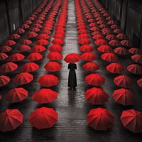 Dame met rode paraplu tussen heel veel andere rode paraplu's