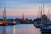 Damsterhaven in Delfzijl met zicht op de kerk in Farmsum tijdens zonsondergang in tegenovergestelde richting, waardoor de lucht pastel kleurt.