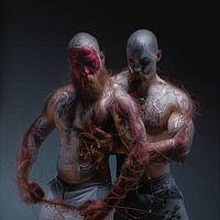 Stel je voor: een krachtig en intrigerend kunstwerk dat de zintuigen prikkelt met de afbeelding van twee dansende bodybuilders, die de mysterieuze uitstraling hebben van wezens die te lijken zijn opgestaan uit de dood. Tegen een neutrale grijze achtergrond, die de scène een bijna etherische kwaliteit geeft, komen deze figuren tot leven…