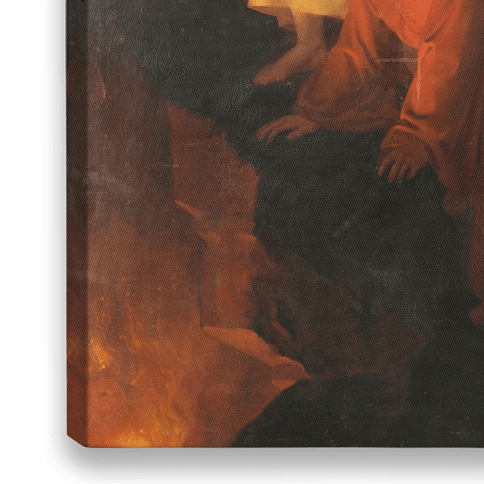 Op een oppervlak met uitgesproken roodachtige tinten zijn de figuren van Dante en Vergilius te onderscheiden. In het bovenste deel van het schilderij zit Vergilius, gekleed in een oude witte tuniek en gekroond met laurierblaadjes, over een paar rotsen en steekt hij met een rustige uitdrukking zijn rechterhand op als teken van spreken. Onder hem legt Dante, gekleed in het rood als in een middeleeuws gebruik en gekroond met laurierblaadjes, zijn torso om zijn handen op de rotsen te leggen waarin hij relaisseert. Hij observeert met een afschuwelijk gebaar het tafereel dat zich op de achtergrond ontwikkelt: in een holte die linksonder in het schilderij ligt, branden intense vlammen, waaronder enkele personages die op prijs worden gesteld. De roodachtige kleur van de vlammen die uit het inferno komen, dringen in deze tonaliteit het doek binnen.