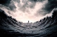 Dit dramatische beeld toont een moedige man die standvastig op het wateroppervlak staat terwijl twee enorme, dreigende golven op hem afrollen. De donkere, bewolkte lucht benadrukt de dreigende sfeer, die doordrongen is van een diepe eenzaamheid en melancholie. De man lijkt nietig tegenover de machtige natuurkrachten, wat de thema's…