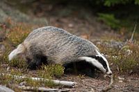 Das ( Meles meles ) zoekt met zijn neus op de grond naar voedsel in het bos, Europa.