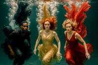 Drie figuren doordringen samen het element water alsof ze een onzichtbare drempel oversteken - vastberaden, verenigd, onbevreesd. Zwart, goud en rood zijn niet alleen de kleuren van hun kleding, maar dragen symboliek in zich: het verborgene, het verlichte en het levende. Hun houding is gesloten, gefocust, naar voren gericht - alsof hun…
