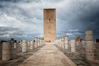 De Hassan Toren, de minaret van de incomplete moskee in Rabat in Marokko. Dreigende regenwolken hangen boven de stad.