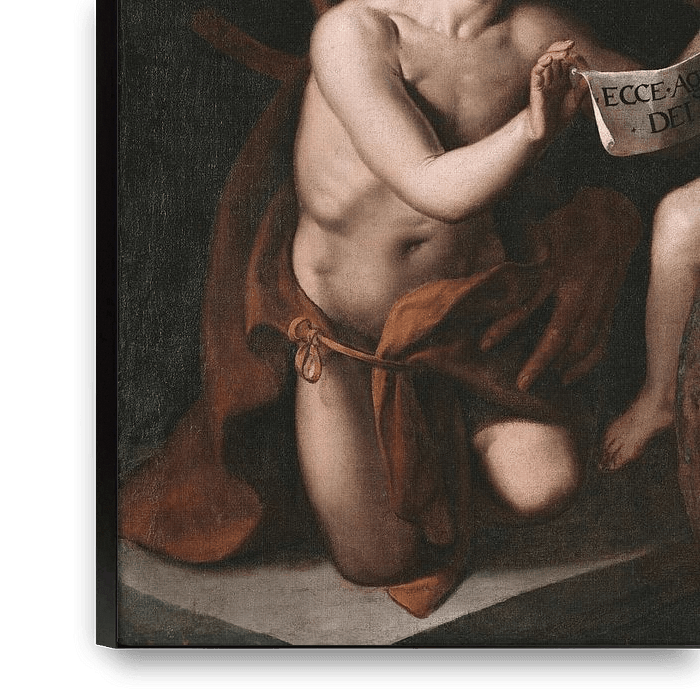 In dit aantrekkelijke werk wordt de Maagd direct naar de kijker gekeken, haar aandacht wordt even weggetrokken van haar kind, dat op haar schoot zit. Haar rechterhand houdt zachtjes de arm van Christus vast, die zich uitstrekt om het haar van het kindje Johannes de Doper aan te raken. Johannes houdt op zijn beurt een klein spandoekje omhoog met de inscriptie "ECCE AGNV- DEI", "Zie het Lam Gods", de woorden van Johannes over Christus bij het doopsel (Johannes 1,36). Het rieten kruis, het gebruikelijke attribuut van Johannes de Doper, wordt vastgehouden door zijn moeder, Elizabeth, terwijl Jozef vanuit de schaduwrijke achtergrond naar het tafereel kijkt.