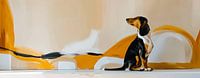 Deze Teckel kan niet wachten tot hij wordt uitgelaten. Hij kijkt geduldig of z'n baasje de riem ook pakt. Door de kleurige achtergrond in oranje, zwart en wit tinten, de kleuren die ook in de vacht van de Teckel voorkomen geeft het geheel een rustig beeld.