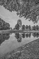 De licht hellende scheven toren van de Friese hoofdstad Leeuwarden in zwart/wit en weerspiegeld in het stilstaande water van de stadsgracht.