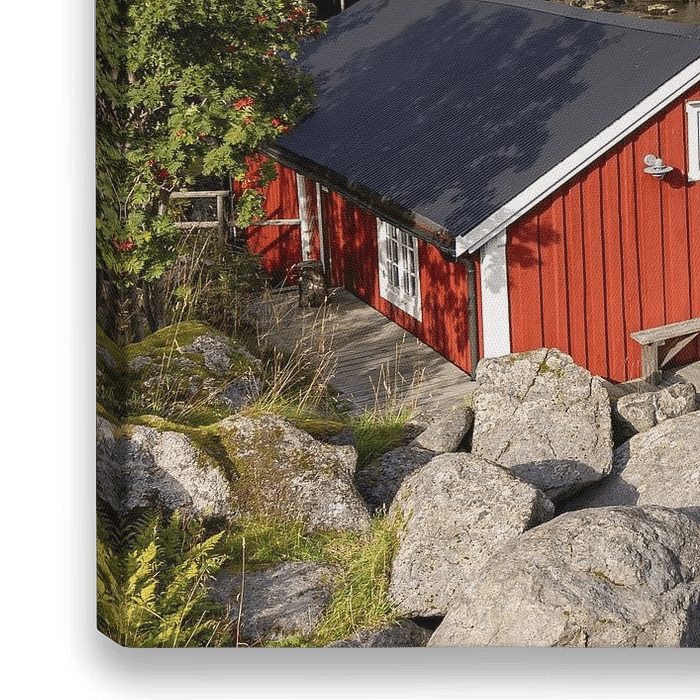 De eilandjes van de Lofoten met de gekleurde huisjes op palen staand in het zeewater. De eilandjes worden verbonden met tal van bruggen.