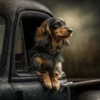 Stoer en schattig kunstwerk van een langharige ruwharige teckel die trots uit het raam van een oude roestige pick-up kijkt, ideaal als humoristische wanddecoratie.