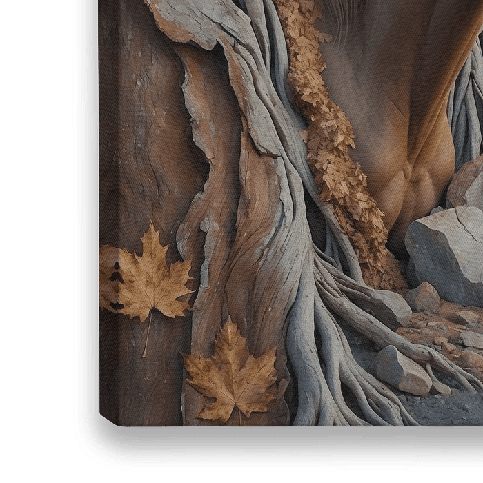 De Stroom in Wortel en Steen toont een edel ros dat oprijst uit verweerde wortels, ruwe rotsen en herfstblad. Zijn vacht glanst als zonlicht op rivierklei, zijn blik is helder, gefocust en vrij. Dit paard is geen symbool van beweging, maar van balans — tussen aarde en water, kracht en rust.