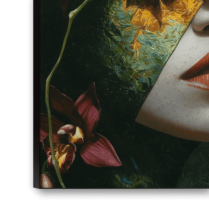 Samenspel tussen de natuurlijke wereld en menselijke trekken, waarbij het gezicht van een vrouw gedeeltelijk verborgen gaat onder een weelderige sluier van orchideeën. De bloemen, rijk aan detail en levendigheid, zijn afgebeeld in realistische tinten van geel en groen met dieprode accenten, en lijken bijna uit de duisternis van de achtergrond te groeien. Hun organische vormen en kleuren contrasteren met de gladde, porseleinachtige huid van het gezicht, dat sereniteit en mysterie uitstraalt.