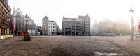 Een situatie die je in het daglicht niet vaak zal tegenkomen: een (bijna) volledig verlaten Dam in de hoofdstad Amsterdam. De mist begon net op te klaren en geeft deze panorama een sprookjesachtig tintje.