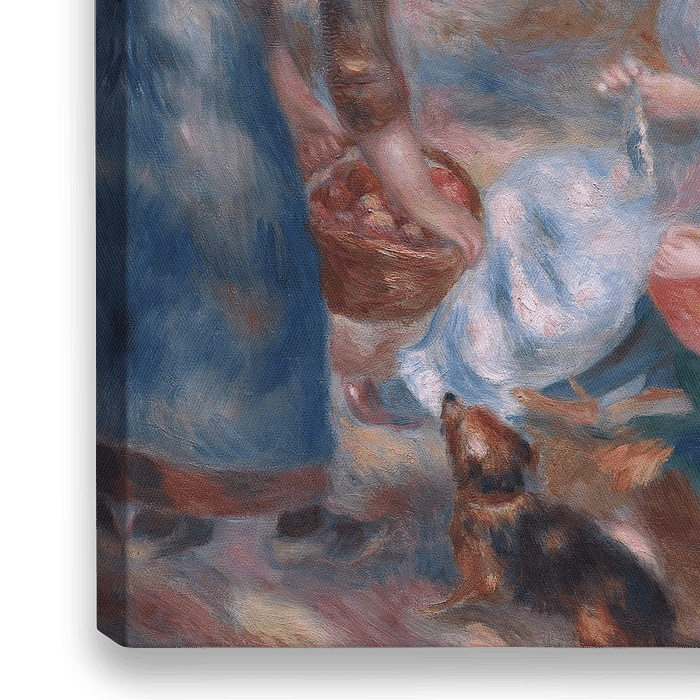 Dit schilderij toont een jong plattelandsmeisje dat appels aanbiedt aan Renoir's vrouw, Aline. De jongen met de strohoed mag dan de neef van de kunstenaar zijn, Edmond, maar het jonge meisje met het lint in haar haar is niet geïdentificeerd. De figuren, die baden in het zachte, gedempte zonlicht, worden verenigd door de vloeiende penseelstreken die het doek bedekken. De springende hond zorgt voor een accent van humor en beweging in een verder rustige omgeving. De foto werd waarschijnlijk voltooid in Essoyes, in het oosten van Frankrijk.