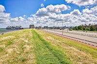 Een zomer beeld van de dijk bij Den Helder met zicht op de veerhaven Den Helder - Texel. Ook Hotel Lands End Den Helder is goed te zien. Ook helemaal links een stuk van Koninklijk Instituut voor de Marine.
