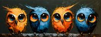 The Guardians of Wisdom" is een meesterlijke afbeelding van vier uilen die de veranderlijkheid en vindingrijkheid van de natuur vastleggen met hun intense blik en levendige aanwezigheid. Elke uil is weergegeven in een andere, levendige tint - van warm goudgeel en diep hemelsblauw tot levendig oranje en mystiek middernachtblauw - en…