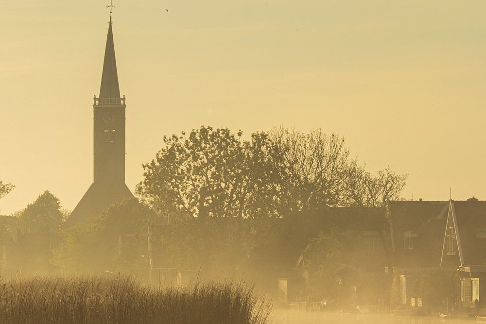 Mist boven het water aan de rand van Schermerhorn, een pittoresk dorpje in Noord-Holland. Aan de horizon doemt de kerktoren op, terwijl de huizen aan het water door het zachte licht van de opkomende zon verlicht worden. Een serene sfeer deze prachtige lenteochtend.