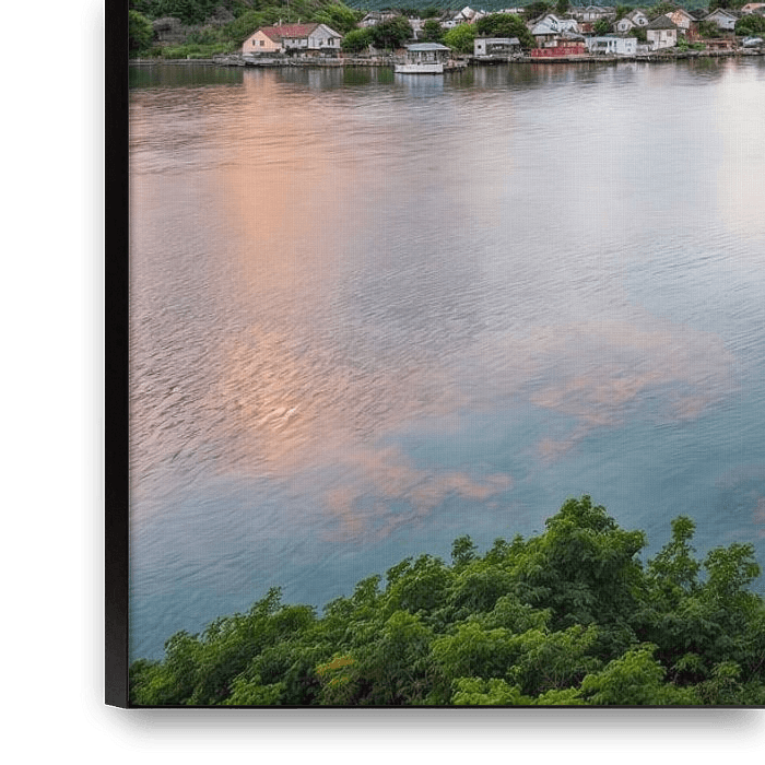 Deze indrukwekkende foto toont een pittoresk vissersdorpje op de Lofoten, genesteld in een spectaculair berglandschap. De rood en geel geschilderde houten huizen staan in perfect contrast met de imposante rotswanden die worden verlicht door de avondzon. Het kalme water van de fjord weerspiegelt de warme kleuren van de lucht en de…