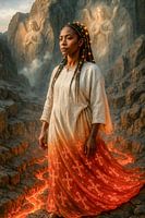 Een vrouw staat als een monument voor innerlijke zekerheid tussen gloeiend rode kliffen waaruit vloeibaar vuur gutst. Haar eenvoudige gewaad, dat overgaat in een brandende rok van licht en kruissymbolen, gloeit niet uit angst, maar uit genade. Ze is niet verbrand - ze is ontstoken.