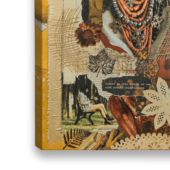 Collage, mixed media. Een analoge collage, niet op de computer samengesteld, maar snipper voor snipper bij elkaar verzameld, gescheurd, geschoven en geplakt.