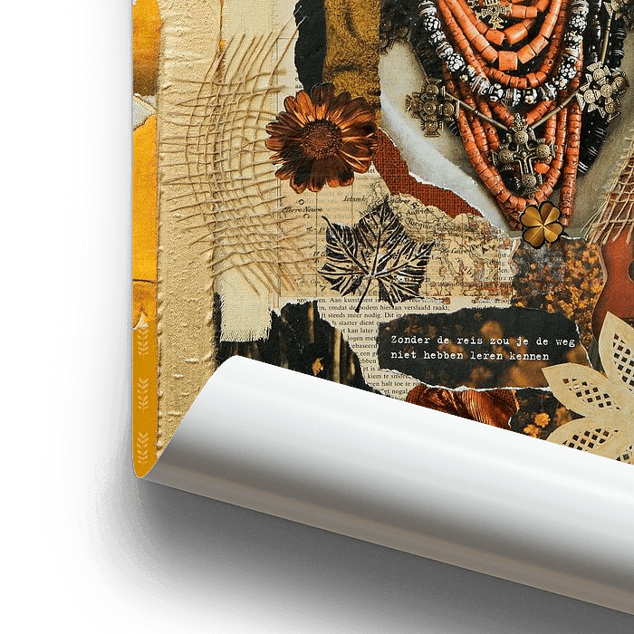 Collage, mixed media. Een analoge collage, niet op de computer samengesteld, maar snipper voor snipper bij elkaar verzameld, gescheurd, geschoven en geplakt.