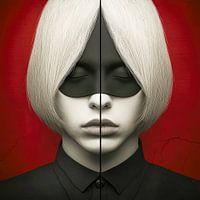 Deze afbeelding geeft een nieuwe betekenis aan het motief van dualiteit. De rode en zwarte achtergrond, die de figuur onderstreept, staat in scherp contrast met de kalme gelaatstrekken van de hoofdpersoon. De uitdrukking van de persoon is teruggetrokken, bijna meditatief, alsof hij in diepe innerlijke reflectie is. Het zwart, dat de…