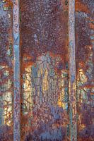 Een afbladderende verf op een roestige metalen wand. De schoonheid van het verval. Deze verweerde wand is best fotogeniek. Oranje, blauw en geel zijn de kleuren van deze plaat.