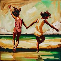 "The Leap into Joy" van Jan Keteleer vangt een moment bevroren in de tijd, waar twee jonge meisjes, in levendige badpakken, gevangen zijn in de lucht boven een rustige zee. Het is een zomerse dag en de zonnestralen dompelen in het kalme water en creëren een sprankelende achtergrond voor het tafereel van jeugdige uitbundigheid. De…