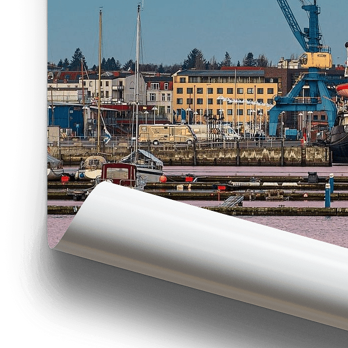 Koop de foto De stadshaven in de vroege ochtend in de Hanzestad Rostock van Rico Ködder op canvas, aluminium dibond, (ingelijste) fotoprint, behang en ArtFrame, op maat geprint in Fine-Art kwaliteit.