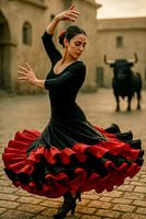 De scène ziet eruit als een schilderij dat uit de tijd is gevallen: een flamencodanseres, helemaal in het zwart en rood, staat midden in een historisch steegje, omlijst door ruwe stenen en stoffige geschiedenis. De achtergrond vervaagt in een zacht, gouden licht - een laatste vleugje dag voordat de schemering alles in de schaduw…