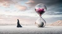 Een gigantische zandloper staat in een uitgestrekt, stil woestijnlandschap en torent boven de kale omgeving uit als een monument voor de tijd. Maar deze zandloper bevat geen gewone elementen. In het bovenste gedeelte zweeft een pulserende wolk van felroze en violet, die eruitziet als levensadem. Op de bodem rust een zware, grijze bol…